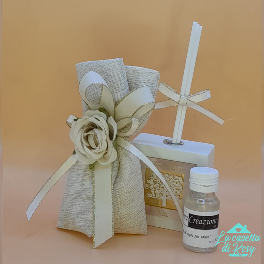 Scatola profumatore albero vita in resina con profumino. Sacchetto cotone oro con rosa in tessuto. Confezionato con 5 confetti mandorla.