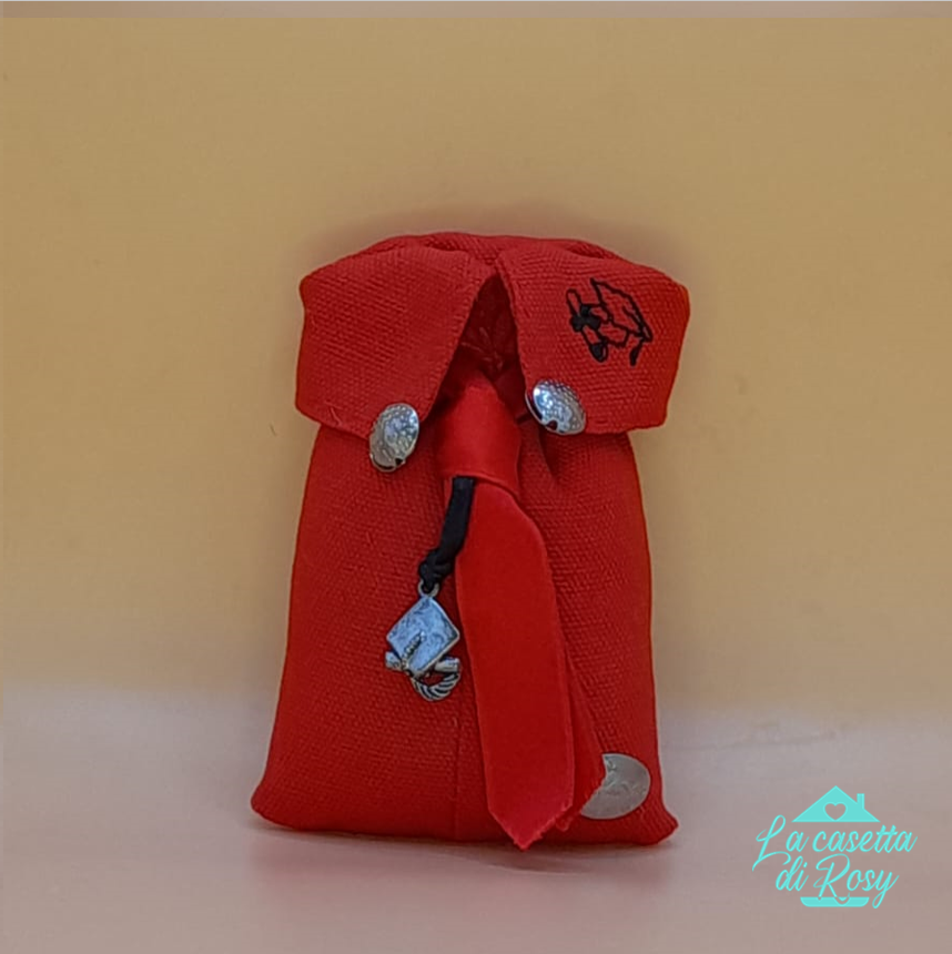 Sacchetto laurea cotone con ricamo risvolto cravatta. Ciondolo tocco argento. confezionato con 5 confetti mandorla