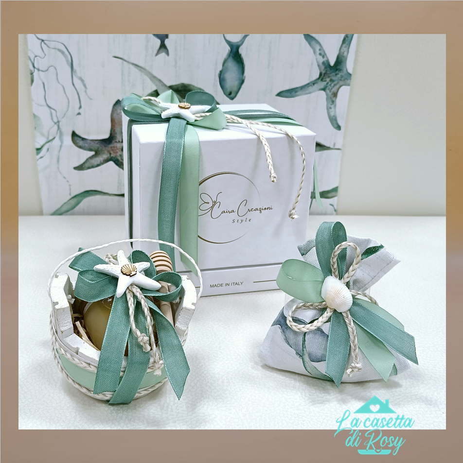 Bomboniera in scatola di cartoncino con tinozza in legno. Contenente un vasetto di miele, spargimiele e sacchetto profumato. Decorato con nastri verde acqua e conchiglie e […]