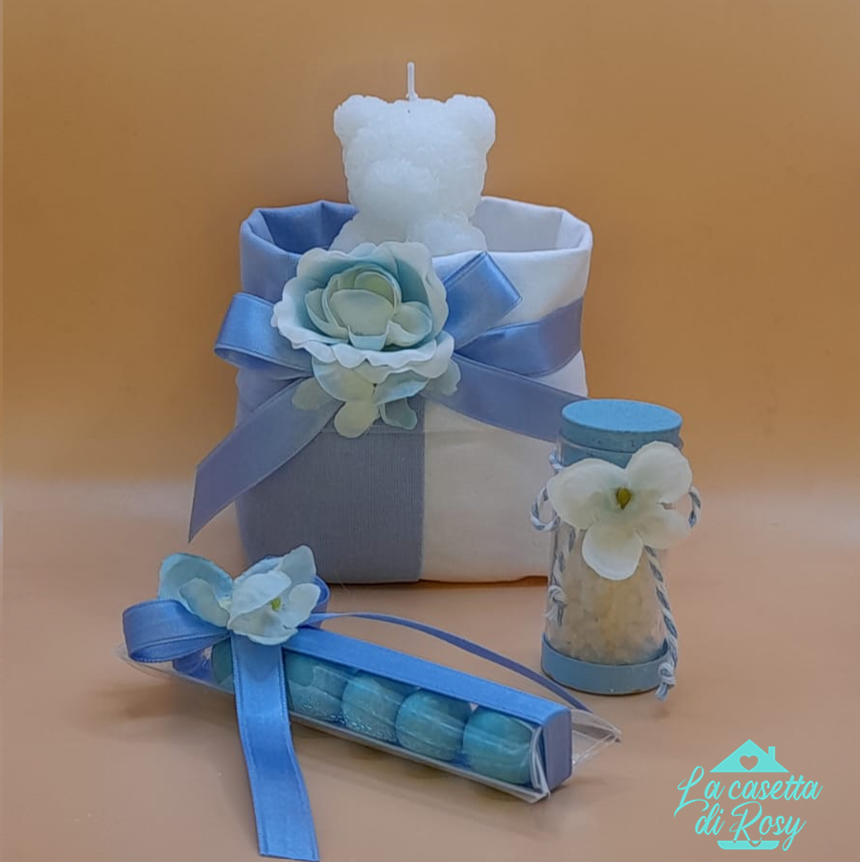 Contenitore in cotone porta oggetti confezionata in elegante scatola decorata con fiori di tessuto, contenente candela a forma di orsetto e sali profumati per aromaterapia. 5 […]