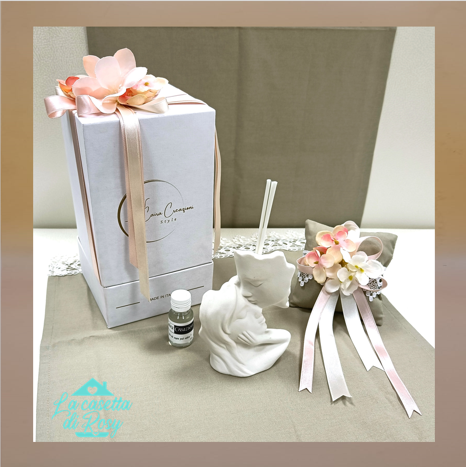 Statuina profumatore in resina Bacio con sacchetto profumato. Presentato con elegante scatola in cartoncino, decorata con nastri e fiori sfumati colore pesca. Confezionato con sacchettino con […]