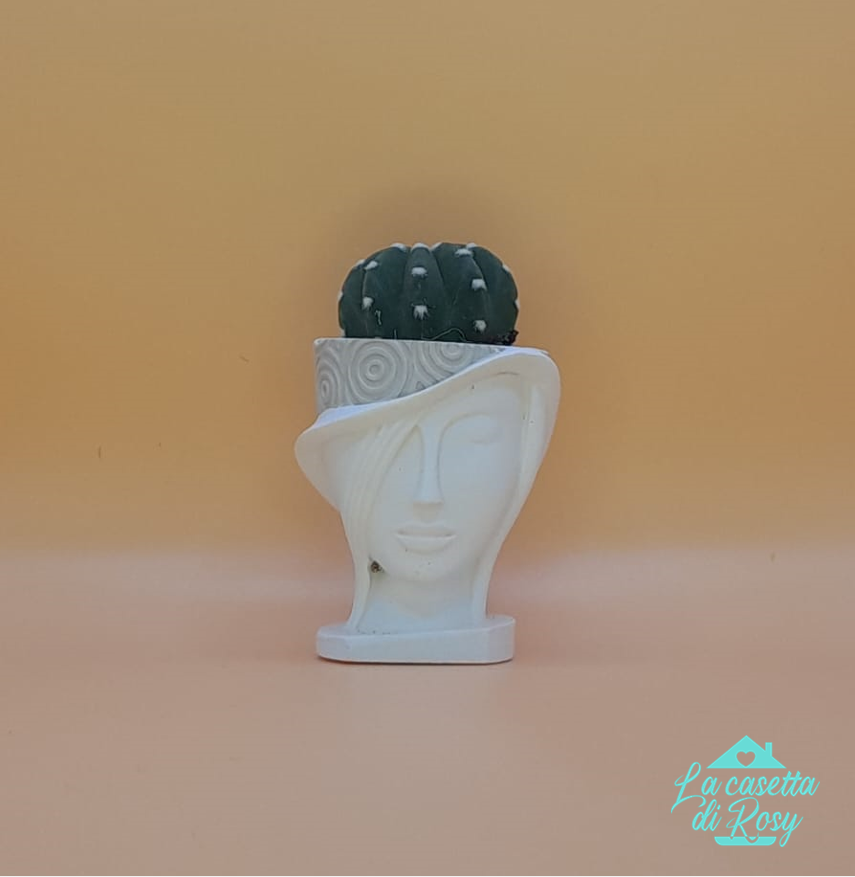 Descrizione vasetto bomboniera con il volto di donna stilizzato. Contiene 1 piantina grassa. Confezionato con n.5 confetti mandorla bianco.